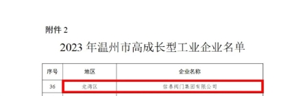 近日,溫州市人民政府辦公室公布了2023年溫州市領(lǐng)軍型工業(yè)企業(yè)、高成長(zhǎng)型工業(yè)企業(yè)的名單,信泰閥門(mén)集團(tuán)有限公司榮獲“2023年溫州市高成長(zhǎng)型工業(yè)企業(yè)”榮譽(yù)稱號(hào)。