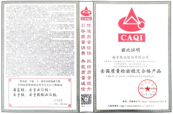 近日,中金環(huán)境旗下南方泵業(yè)股份有限公司在中國質(zhì)量檢驗協(xié)會舉辦的“產(chǎn)品和服務(wù)質(zhì)量誠信承諾”主題活動中,正式通過了審核組專家對相關(guān)體系文件和主要產(chǎn)品的全面審核,取得了“全國通用機械行業(yè)質(zhì)量領(lǐng)先品牌”“全國質(zhì)量檢驗穩(wěn)定合格產(chǎn)品”“全國產(chǎn)品和服務(wù)質(zhì)量誠信品牌”評定證書。