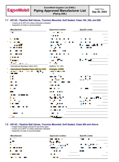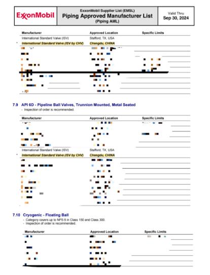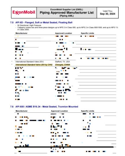 在美國埃克森美孚(ExxonMobil)最新發(fā)布的批準供應商列表(AML)中,成都成高閥門股份有限公司(CHV)在以下產品分類中獲得正式批準:
