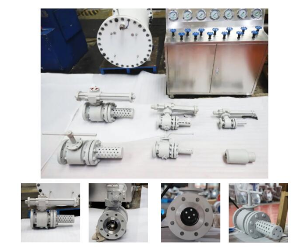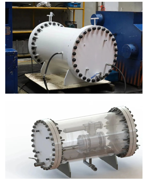 該閥門(mén)除了常規(guī)的試壓試驗(yàn),還需進(jìn)行模擬水下的高壓試驗(yàn)。為此,我們自主開(kāi)發(fā)了一套水下模擬高壓試驗(yàn)艙,用于模擬水下450米的海底環(huán)境。在測(cè)試中,閥門(mén)成功通過(guò)模擬試驗(yàn)(殼體、密封、動(dòng)作等)。