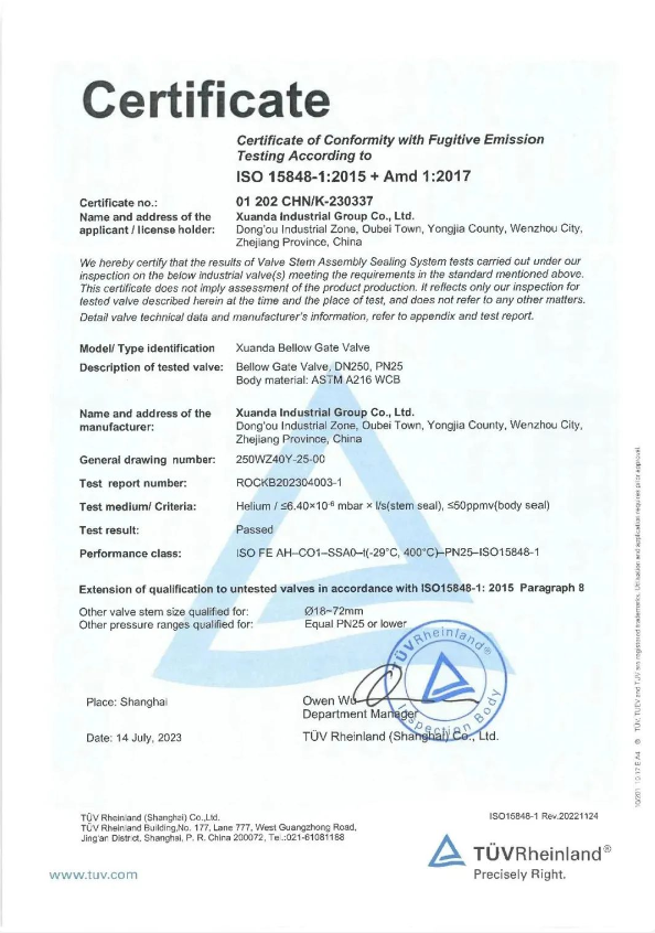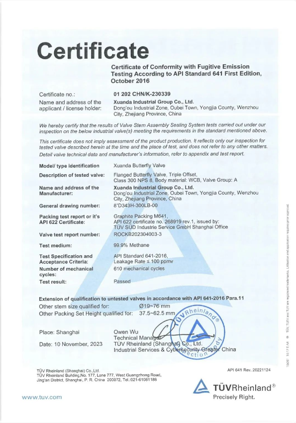 宣達(dá)實(shí)業(yè)集團(tuán)金屬硬密封蝶閥、波紋管閘閥和波紋管截止閥在德國(guó)TUV萊茵的見證下,成功通過了API641以及ISO15848-1:2015( CO2級(jí))低泄漏產(chǎn)品型式試驗(yàn)。