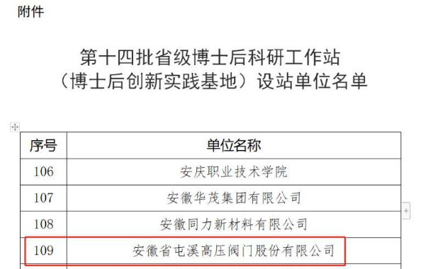 近日,安徽省人社廳發(fā)布了《關(guān)于批準數(shù)據(jù)空間研究院等110家單位設(shè)立第十四批省級博士后科研工作站的通知》。經(jīng)區(qū)、市人力資源和社會保障局推薦、現(xiàn)場答辯等多環(huán)節(jié)嚴格送選,安徽省屯溪高壓閥門股份有限公司成功獲批設(shè)立省級博士后科研工作站。