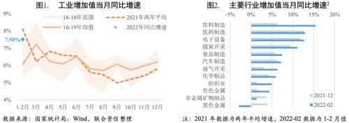 工業(yè)生產(chǎn)延續(xù)小幅回升態(tài)勢,總體較為強(qiáng)勁。2022年1-2月,受益于振作工業(yè)經(jīng)濟(jì)運(yùn)行、推動工業(yè)高質(zhì)量發(fā)展系列政策措施加快落地,工業(yè)企業(yè)節(jié)后有序復(fù)工復(fù)產(chǎn),我國規(guī)模以上工業(yè)增加值同比增長7.50%,較上月有所加快,延續(xù)四季度以來的回升態(tài)勢。從季節(jié)性水平來看,2022年1-2月工業(yè)增加值同比增速高于疫情前2016-2019年同期水平,雖不及2021年同期兩年平均增速[1]水平,但2021年初主要是就地過年政策提振了工業(yè)生產(chǎn)表現(xiàn),存在一定高基數(shù)影響,所以今年1-2月工業(yè)生產(chǎn)增長總體較為強(qiáng)勁。