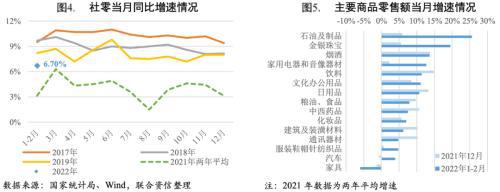 消費(fèi)修復(fù)有所加快,地產(chǎn)鏈條商品銷售增速回落明顯。在春節(jié)消費(fèi)和冬奧因素帶動下,2022年1-2月社會消費(fèi)品零售總額(下稱“社零”)7.44萬億元,同比增長6.70%,較2021年12月有所加快,但較疫情前水平仍有一定差距。限額以上商品方面,石油及制品銷售額增速大幅增長,油價(jià)上漲因素起到了的支撐作用;金銀珠寶、家用電器等消費(fèi)升級類商品零售增長有所加快,促消費(fèi)政策效果有所顯現(xiàn);受地產(chǎn)銷售拖累,家具、建筑及裝潢材料銷售增速回落明顯;年初汽車供給有所改善,且疫情下居民短途自駕出行需求增加,疊加汽車下鄉(xiāng)等政策促進(jìn)作用,汽車銷售增長轉(zhuǎn)正。3月以來多地爆發(fā)了新一輪疫情,或?qū)⒅萍s消費(fèi)的進(jìn)一步復(fù)蘇。