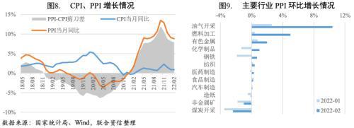 CPI同比漲幅總體平穩(wěn),PPI同比漲幅繼續(xù)回落。CPI方面,受春節(jié)因素和國際能源價(jià)格波動等共同影響,2022年2月CPI同比漲幅與上月持平在0.90%,環(huán)比漲幅擴(kuò)大0.20個(gè)百分點(diǎn)至0.60%。其中,豬肉價(jià)格下行帶動食品價(jià)格同比跌幅擴(kuò)大;能源價(jià)格上漲帶動非食品價(jià)格漲幅擴(kuò)大。PPI方面,受原油、有色金屬等國際大宗商品價(jià)格上漲等因素影響,2月PPI同比增幅雖然較1月回落0.30個(gè)百分點(diǎn)至8.80%,但回落幅度明顯減緩,且環(huán)比由降轉(zhuǎn)漲,輸入型通脹壓力抬升。從主要行業(yè)來看,煤炭產(chǎn)量和市場供應(yīng)量持續(xù)增加,煤炭價(jià)格繼續(xù)回落;國際原油、有色金屬等大宗商品價(jià)格上漲,帶動國內(nèi)油氣開采、燃料加工、有色金屬等相關(guān)行業(yè)價(jià)格上行。2月PPI-CPI剪刀差繼續(xù)收窄,但PPI回落節(jié)奏明顯放緩,且近期俄烏沖突升級使得輸入性通脹壓力上升,上游價(jià)格上升動能加強(qiáng),中下游企業(yè)的成本壓力仍然較大,盈利情況改善預(yù)期轉(zhuǎn)弱,中下游行業(yè)信用風(fēng)險(xiǎn)值得關(guān)注。