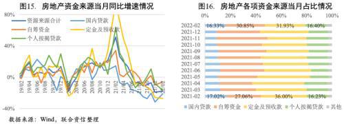 房企銷售回款承壓明顯,短期內(nèi)資金面壓力依然較大。2022年以來,多地下調(diào)購房首付比、放松限購限售、調(diào)降房貸利率、加快放款節(jié)奏,但在政策放松加碼的同時(shí),1-2月地產(chǎn)銷售降溫拖累房地產(chǎn)開發(fā)投資額同比增速繼續(xù)探底,房企拿地、新開工的積極性較低。從地產(chǎn)資金面來看,1-2月份房地產(chǎn)企業(yè)到位資金2.51萬億元,同比增速-17.73%(12月為-19.28%),到位資金情況略有改善,但資金面壓力仍然較大。分項(xiàng)來看,地產(chǎn)銷售疲弱帶動定金及預(yù)收款以及個(gè)人按揭貸款同比降幅有所擴(kuò)大,其中個(gè)人按揭貸款下滑幅度更大,反映出盡管當(dāng)前銀行房貸環(huán)境有所放松,但居民購房需求仍然不足;國內(nèi)貸款和自籌資金同比下滑幅度有所收窄。從地產(chǎn)到位資金結(jié)構(gòu)來看(由于信貸投放有一定的季節(jié)性,所以與上年同期相比),國內(nèi)貸款和個(gè)人按揭占比變化不大,定金及預(yù)收款占比明顯下降,與之對應(yīng)的是地產(chǎn)企業(yè)自籌資金占比的提升,反映出目前在銷售回款承壓的情況下,地產(chǎn)企業(yè)更多的通過自籌資金的方式來緩解現(xiàn)金流壓力,而對自籌資金的依賴性提高也意味著個(gè)體風(fēng)險(xiǎn)以及資金鏈的脆弱性提高。