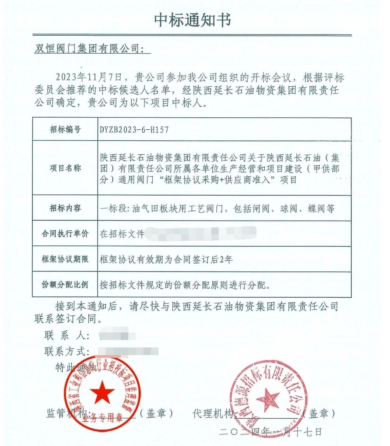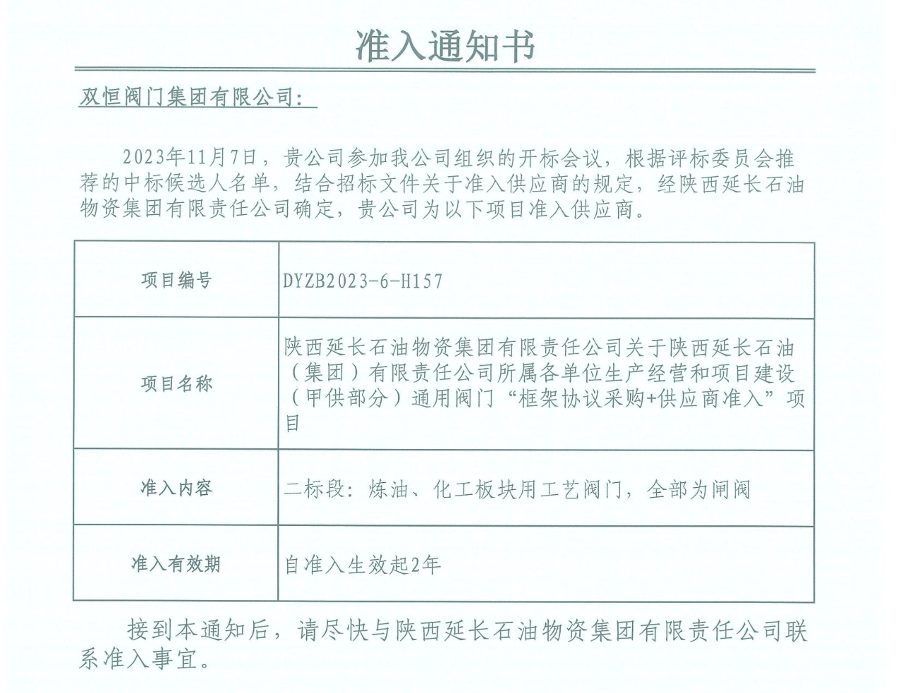 新年伊始,我司捷報(bào)頻傳!經(jīng)過權(quán)威專家評審,眾多國內(nèi)一流閥門企業(yè)激烈角逐,雙恒閥門集團(tuán)公司憑借過硬實(shí)力和良好的商譽(yù)獲得專家組的認(rèn)可,成功中標(biāo)延長石油(集團(tuán))通用閥門框架協(xié)議!我司能從強(qiáng)手如林的競標(biāo)中脫穎而出,標(biāo)志雙恒集團(tuán)在大型煉油、石化領(lǐng)域高端閥門的研發(fā)制造得到了市場的進(jìn)一步認(rèn)可!