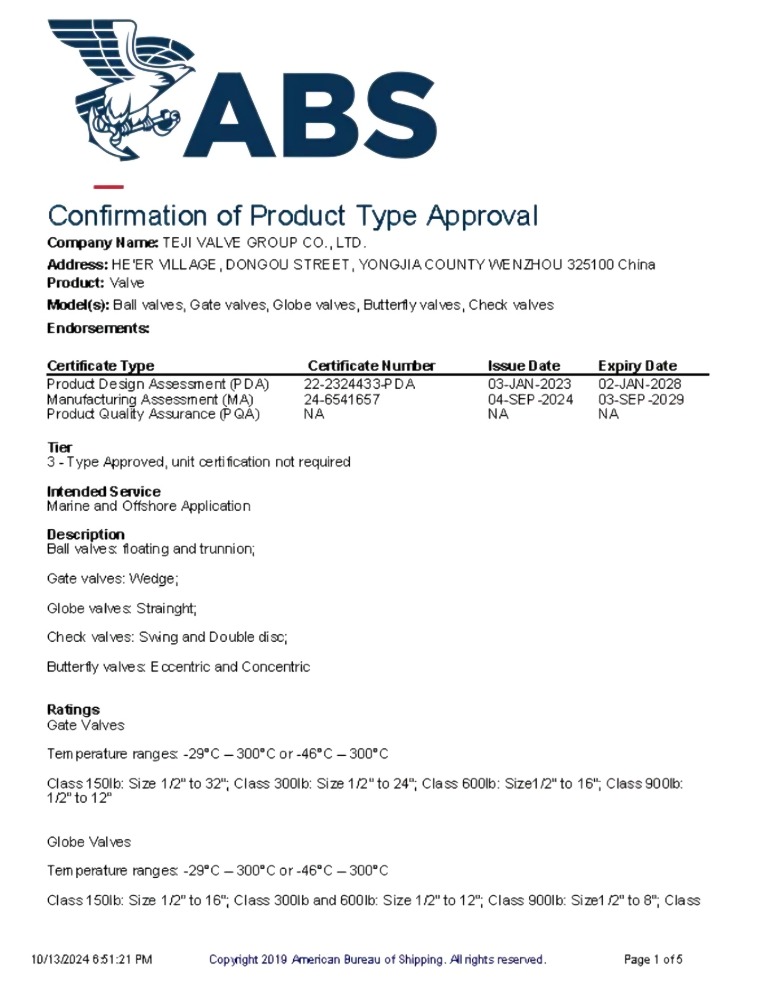 在波瀾壯闊的全球工業(yè)浪潮中,特技閥門集團(tuán)以匠心獨(dú)運(yùn)的產(chǎn)品和堅(jiān)如盤石的服務(wù),贏得了國(guó)內(nèi)外客戶的廣泛贊譽(yù)。近只,特技閥門集團(tuán)成功通過了美國(guó)船級(jí)社(American Bureau of shipping,ABS)的嚴(yán)格審核與認(rèn)證,這不僅是對(duì)特技閥門產(chǎn)品品質(zhì)的又一次國(guó)際認(rèn)可,更是特技邁向世界頂級(jí)閥門制造商行列的重要一步!