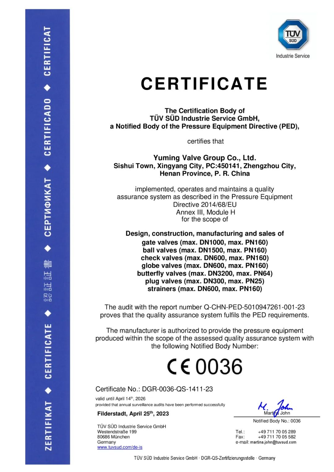 4月25日,宇明閥門集團有限公司順利獲得歐盟認證機構頒發(fā)的CE認證證書,通過了安全指標測定,取得進入歐洲聯(lián)盟市場的通行證。